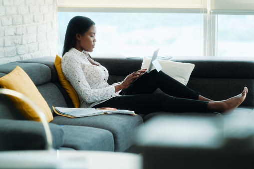 Black Woman Working From Home With Laptop Computer Stock ...